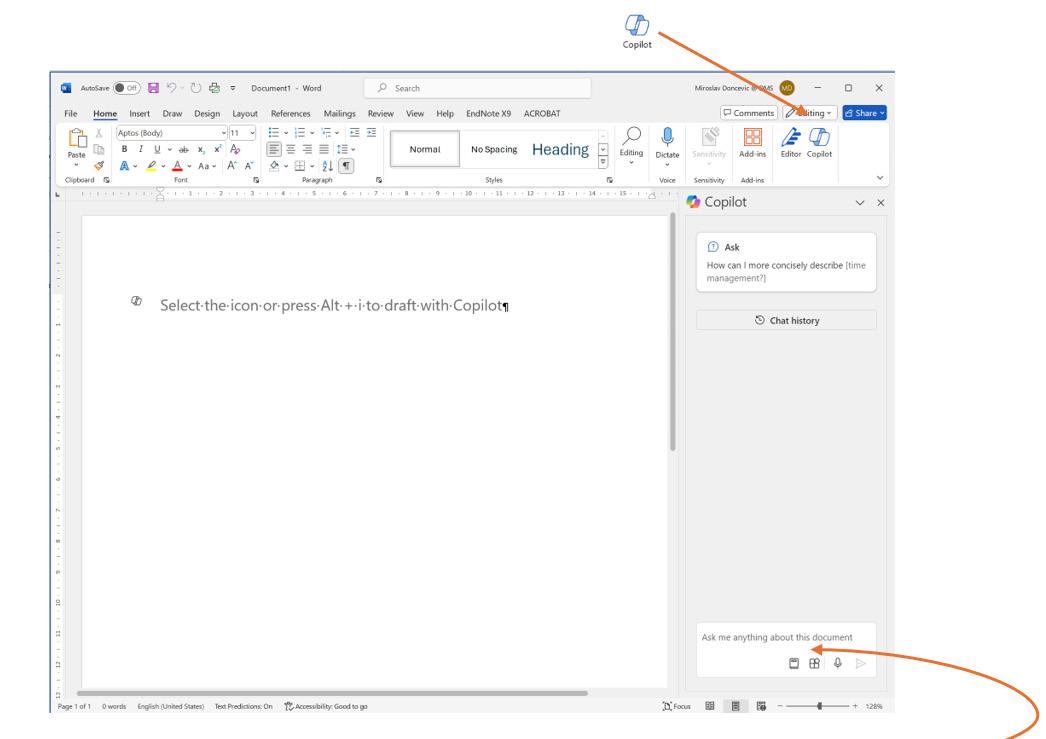 In Microsoft Word, for example, there are two ways to interact with Copilot: