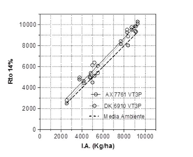 Rendimiento (kg ha-1) de los híbridos 7761 VT3P y 6910 VT3P en función del índice ambiental (I.A.: media todos los híbridos evaluados en cada ambiente) para 15 sitios, que surgen de dos años de la Red de maíz del sur de Buenos Aires.