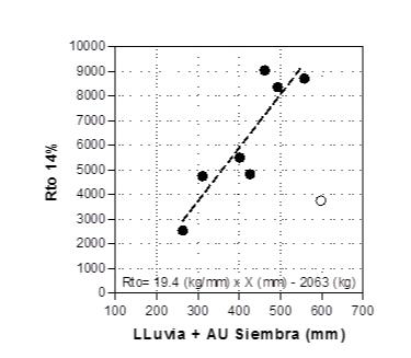 Rendimiento promedio de todos los híbridos en cada sitio en función de los mm de agua disponibles, estimados como las lluvias ocurridas entre diciembre y marzo más el agua útil en el suelo (AU) a la siembra. El punto vacío que corresponde al sitio Bonifacio no se utilizó en el ajuste. P<0.01; r2=0.79. El modelo sería Rto 14% = 19,4 kg/mm x – 2063 kg
