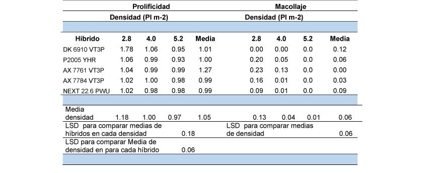 En Bonifacio con densidades relativamente altas y en Falcón bajo una restricción hídrica extrema, no se detectó efecto de la densidad ni del híbrido sobre la prolificidad o el macollaje (P>0.05). En tanto que en Carhué con densidades más bajas que Bonifacio y una restricción menor que Falcón se detectó efecto de la densidad y del híbrido sobre la prolificidad y el macollaje. Como era esperado, la prolificidad fue afectada por la interacción entre el híbrido y la densidad (p<0.05). La interacción se sostuvo en que el híbrido DK 6910 VT3P expresó mayor prolificidad sólo en la menor de las densidades evaluadas.