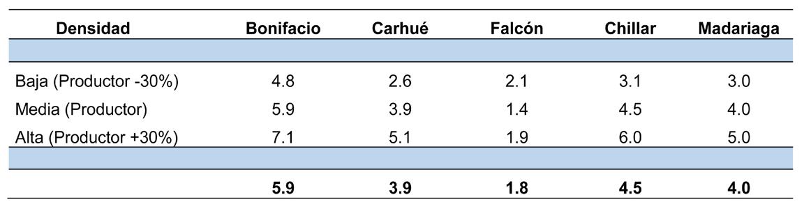 ● Los híbridos y manejos de densidad fueron evaluados en lotes de producción y con tecnología aplicada por el productor. El efecto de la densidad fue relativamente menor y tuvo lugar en Chillar, el sitio de mayor productividad, y en Falcón, el sitio de menor productividad de entre los evaluados. En ambos sitios, el efecto se explicó por una reducción del rendimiento (11%) en la densidad de siembra más baja (productor -30%).
