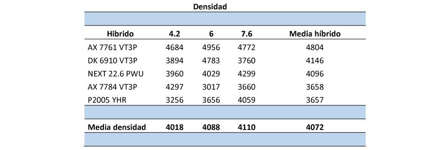 único efecto significativo se presentó en el ambiente más restrictivo, donde la baja densidad presentó también una penalidad de 11 % en el rendimiento respecto a la densidad utilizada por el productor. Estos resultados confirman la elevada tolerancia al estrés de los híbridos actuales que debió expresarse en mayor medida en las altas densidades y que surge de la continua mejora genética. En relación a la tolerancia a estrés, es notable que en Falcón con solo 173 mm de lluvia entre diciembre y marzo y un suelo de 40 cm de profundidad efectiva