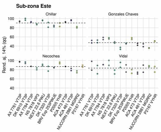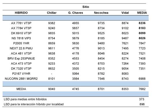 Se detectaron diferencias entre híbridos a través todos sitios salvo en Dorrego que es uno de los ambientes más restrictivos hasta ahora evaluado por esta red (2538 kg ha-1). El grupo de híbridos que se destacó en cada sub-zona no fue el mismo y en algunos casos hubo un cambio importante en el ranking en función de la sub-zona como en el caso de ACA 473 VT3P, DK 7320 VT3P, AX 7784 VT3P, NS 7818 VIP. Sin embargo, los híbridos DK 6910 VT3P y AX 7761 VT3P