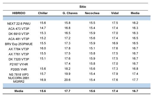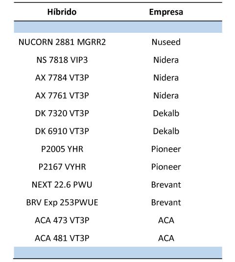 Se evaluaron un total de 12 híbridos provenientes de 6 semilleros (Tabla 2). Todos los híbridos estuvieron representados en todos los sitios dentro de cada sub-zona a excepción de P2167 VYHR que no participo en Chillar ni en Carhué.