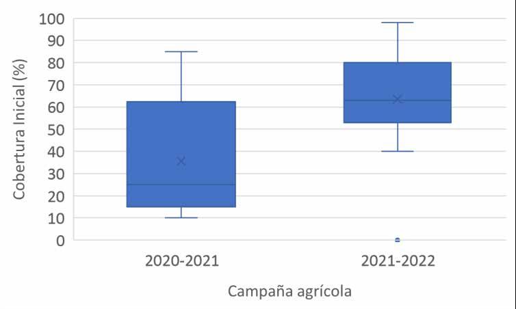 Como antecesor invernal en 54 % de los sitios se hizo barbecho, en 31 % hubo trigo y en un 15 % se hicieron cultivos de servicio (vicia pura o consorciada con triticale).