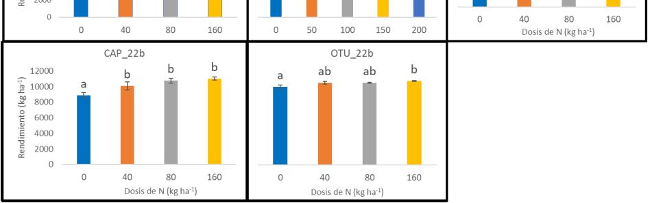 aplicados fueron 0, 40, 80 y 160 kg N ha-1. A su vez, otras dosis N, en general dentro del mismo rango, fueron utilizadas en seis sitios. De acá en adelante todos los tratamientos se los denomina colocando la dosis seguido de la letra N (por ej.: 0N, 40N, 80N, 160 N, etc.).