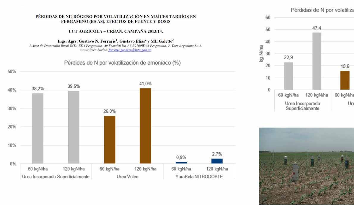en diferentes cultivos y condiciones de aplicación de los fertilizantes. Los resultados muestran cómo utilizando fuentes eficientes se puede lograr disminuir las pérdidas de volatilización; resultando en un aumento de eficiencia del uso de los fertilizantes nitrogenados y logrando asimismo una ventaja ambiental y económica.