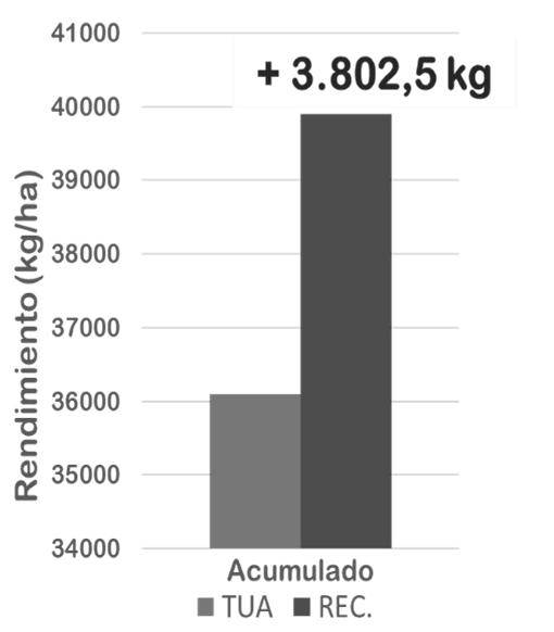 La secuencia de cultivo fue maíz-soja, excepto la campaña 15/16 donde se sembró maní. En todos los años se obtuvieron mapas de rendimientos que fueron procesados y depurados (valores outliers e inliers). Se observó un efecto acumulativo del incremento en rendimientos (Grafico D) del tratamiento B con respecto al A. Para el primer año con cultivo de maíz el incremento de rendimiento fue de 620 kg/ha, pero el último año evidencio 1.412 kg/ha de diferencia con respecto al tratamiento A. En el caso de la soja los incrementos fueron menores, en el año 2018 la región sufrió una sequía histórica y es la menor diferencia que se registró para este cultivo con 165 kg/ha (Grafico C ). El rendimiento acumulado tuvo un incremento de 3.802,5 kg/ha con respecto al tratamiento A.