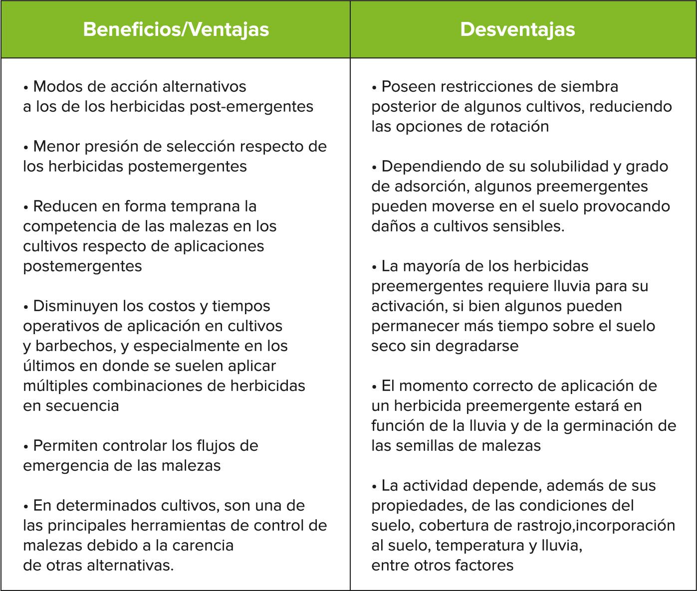 Tabla 1. Ventajas y desventajas de la utilización de herbicidas residuales (Zimdahl, 2007; Congreve y Cameron, 2014).