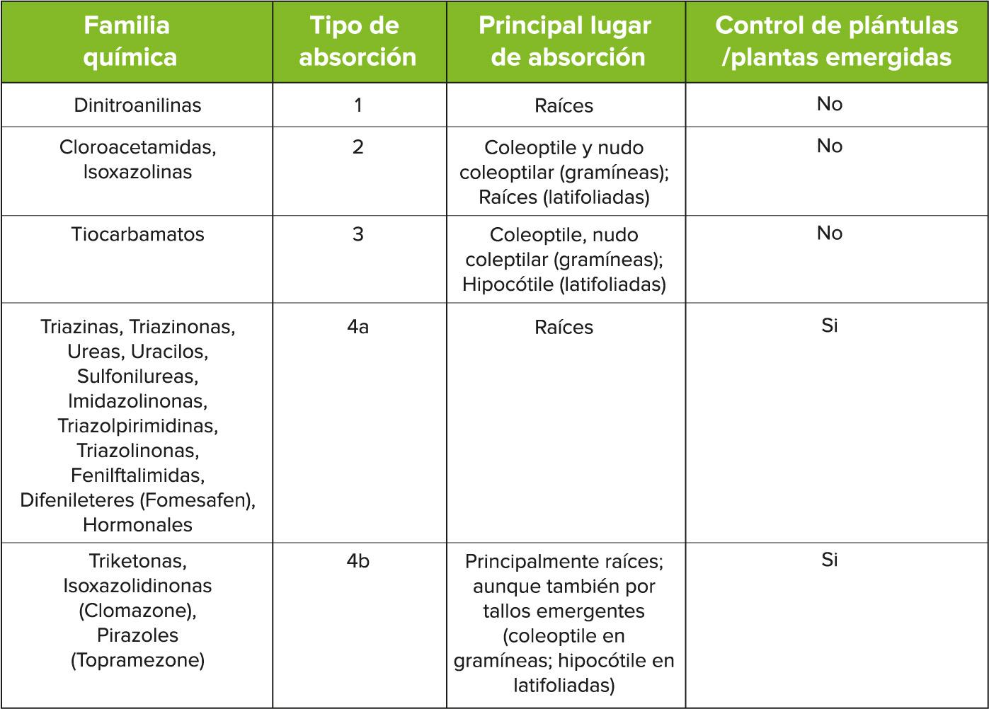 En lo referente a los herbicidas, estos pueden clasificarse en 4 categorías de acuerdo a su lugar de absorción (Tabla 3) (Monaco et al, 2002):