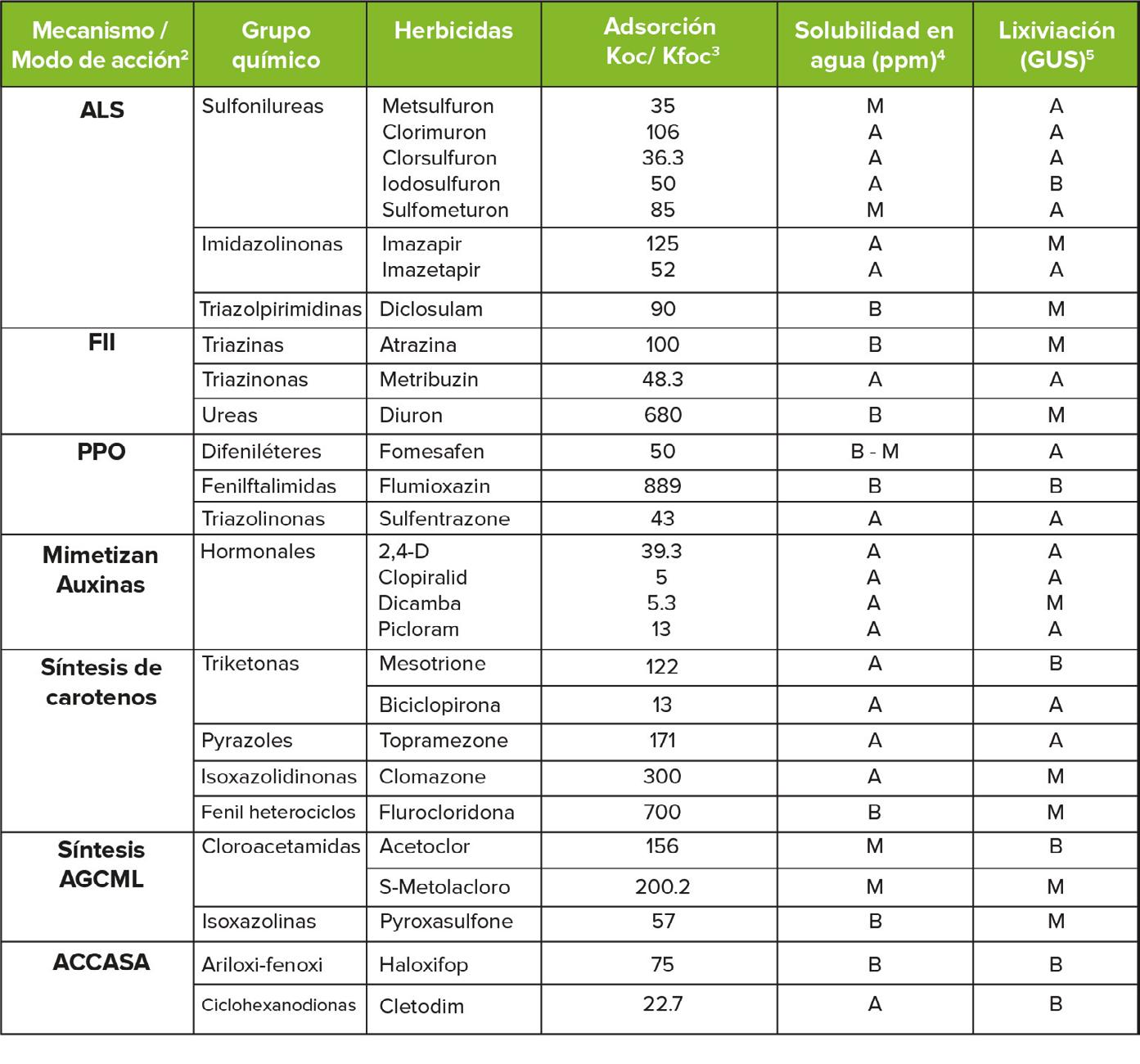 Tabla 7. Adsorción, solubilidad y lixiviación potencial en el suelo de los principales herbicidas con efecto residual según familia y MOA1. (B=baja, M=moderada, A= alta).