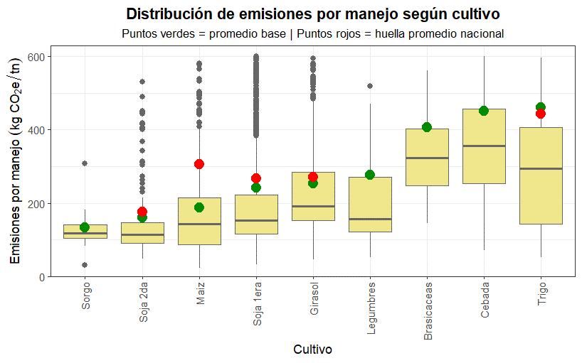 Se observa una alta dispersión de los datos para soja 1ra y girasol, evidenciada por la presencia de numerosos valores atípicos y la extensión de los bigotes en los boxplots. Esta variabilidad se asocia principalmente a la heterogeneidad de manejos registrados (diferencias en tipo y dosis de fertilización, número de labores, rendimientos y condiciones climáticas) junto con la diversidad de regiones donde se producen estos cultivos. En cambio, los cultivos con menor dispersión presentan valores de emisión más consistentes, lo
