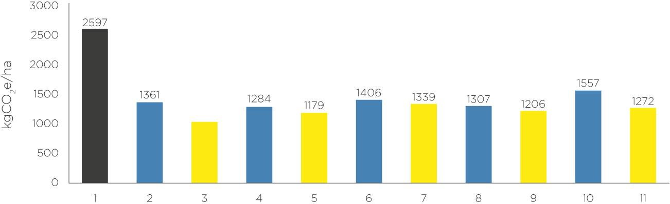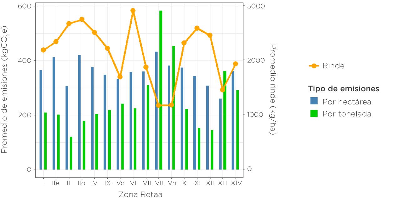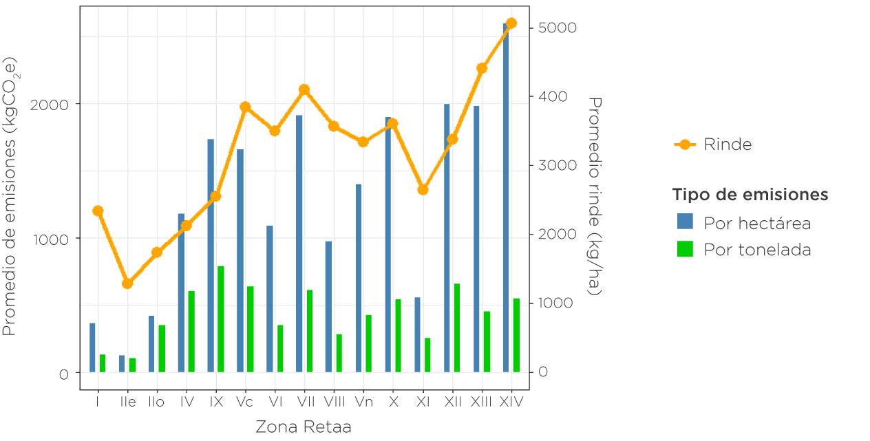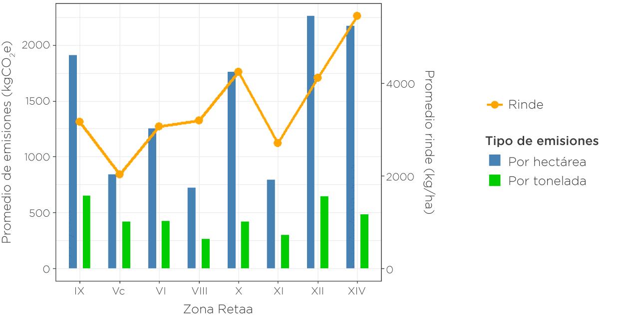 emisiones por tonelada (claro ejemplo de cómo la productividad condiciona el aporte de carbono del sistema). Las emisiones por hectárea más elevadas, posiblemente estén asociadas a varias aplicaciones de insumos o condiciones de manejo más demandantes.