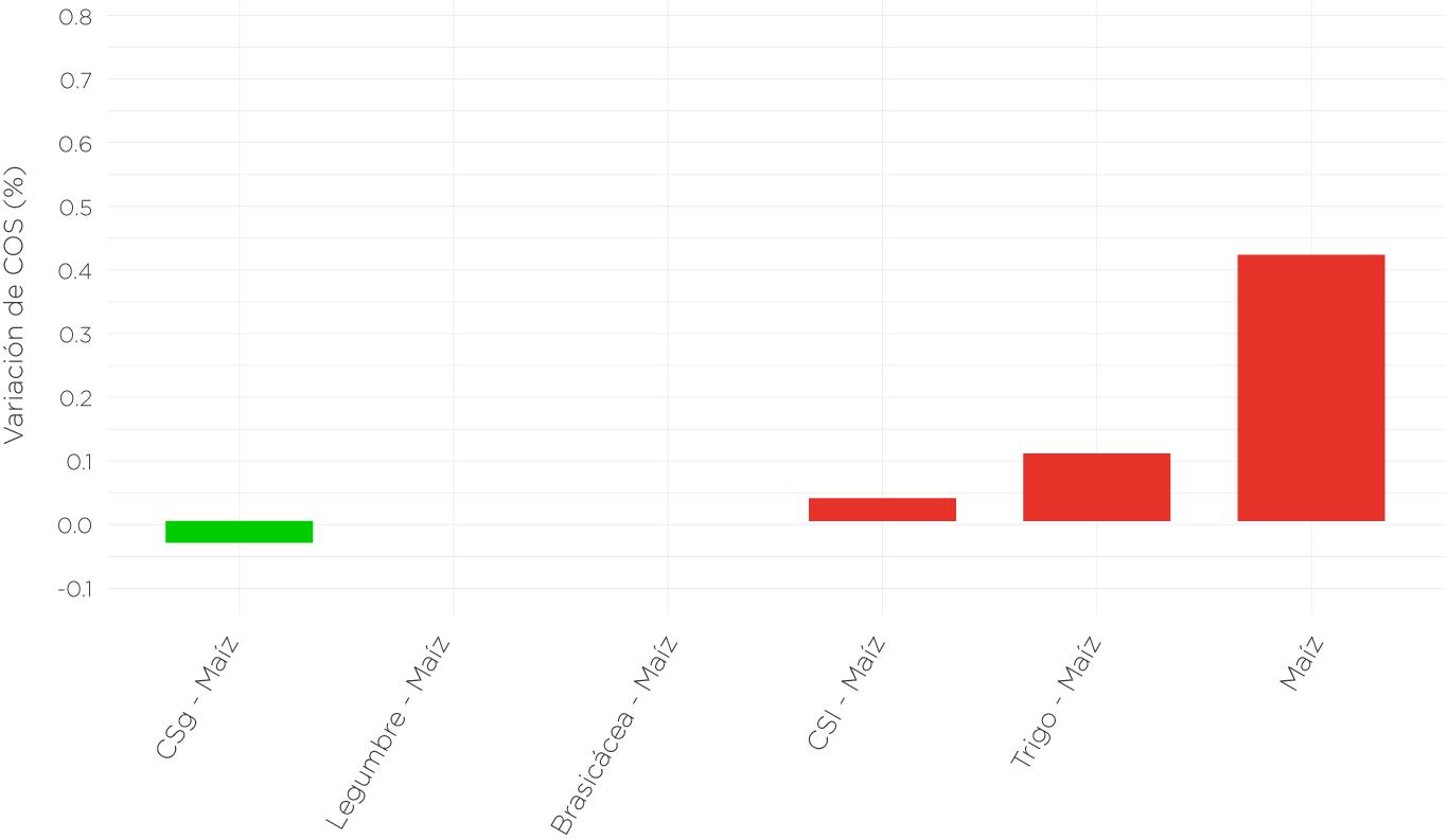La Figura 19 muestra que, en sistemas de monocultivo de maíz, el COS disminuye un 0,42 % respecto de su valor inicial, aproximadamente la mitad observada en el monocultivo de soja o en esquemas de doble leguminosa. En regiones donde los suelos parten de 50 tnC/ha, esta reducción equivale a aproximadamente 0,21 tnC/ha. A su vez, en esquemas de doble cultivo integrados exclusivamente por gramíneas (por ejemplo, trigo-maíz), la pérdida de COS es menor, alcanzando un 0,1 %. Esto representa una reducción cercana a 0,05 tnC/ha en suelos con un stock inicial de 50 tnC/ha, una variación prácticamente imperceptible en términos relativos.