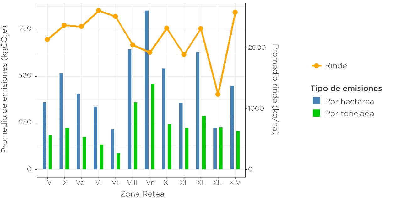 Los valores de emisiones por hectárea muestran diferencias que reflejan oportunidades de mejora en el manejo, especialmente en aquellas zonas donde las emisiones son altas sin un incremento proporcional en el rendimiento.