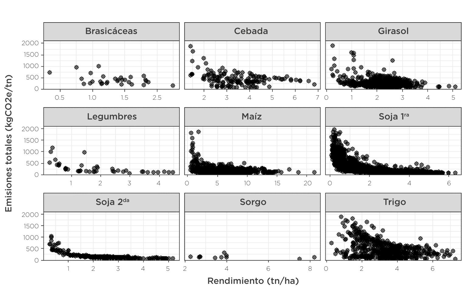 No obstante, la magnitud y variabilidad de las emisiones difiere entre cultivos. En maíz, los puntos llegan a valores muy altos de emisiones y también a valores muy bajos, lo que refleja una amplitud de dispersión mucho mayor que en soja, trigo, sorgo y otros cultivos. El maíz presenta un marcado potencial de mejorar la eficiencia ambiental a través del incremento de rendimiento, ya que los sistemas de mayor productividad tienden a reducir drásticamente las emisiones por tonelada producida.