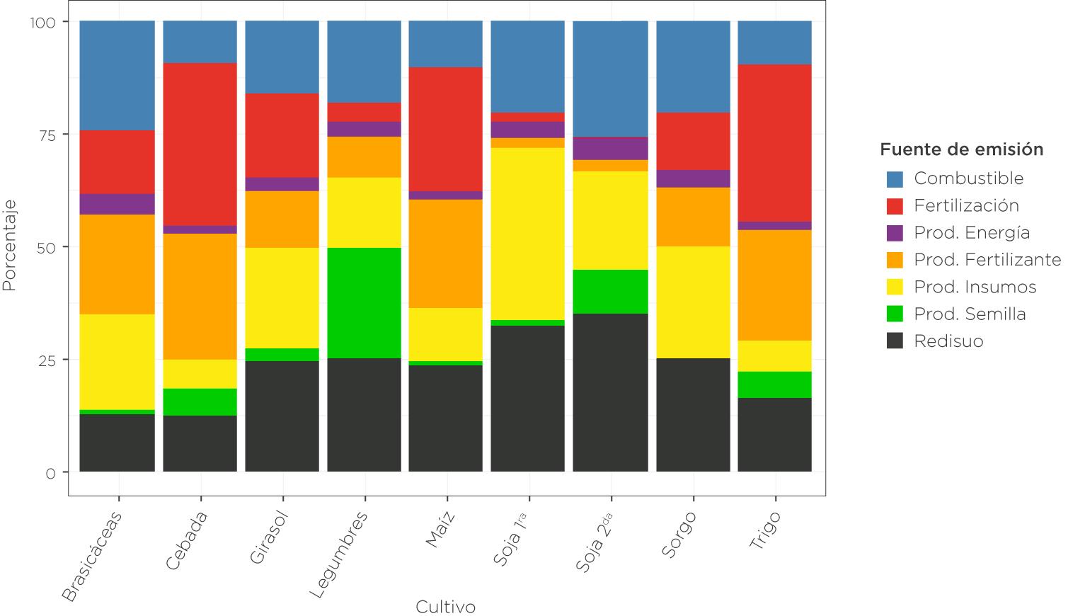 En los cultivos de gramíneas como maíz, trigo y cebada, las emisiones están dominadas por las fuentes asociadas al nitrógeno. Las mayores contribuciones provienen de la producción de fertilizantes nitrogenados y de las emisiones de N2O generadas tras su aplicación en el suelo. Esto reafirma que mejorar la eficiencia en el uso de este nutriente constituye la principal oportunidad para reducir las emisiones de estos sistemas. En el caso del sorgo, era esperable observar un patrón similar al del resto de las gramíneas, con un peso importante de las emisiones vinculadas al nitrógeno. Sin embargo, se destaca una participación relativamente mayor del consumo de combustible y de la producción de insumos aplicados, lo que sugiere una mayor contribución de las labores a campo y del paquete tecnológico asociado a este cultivo.