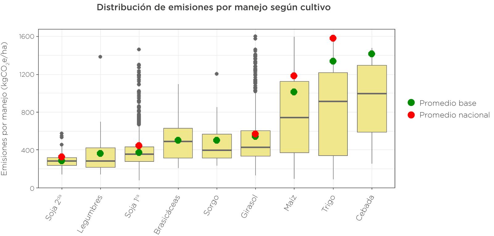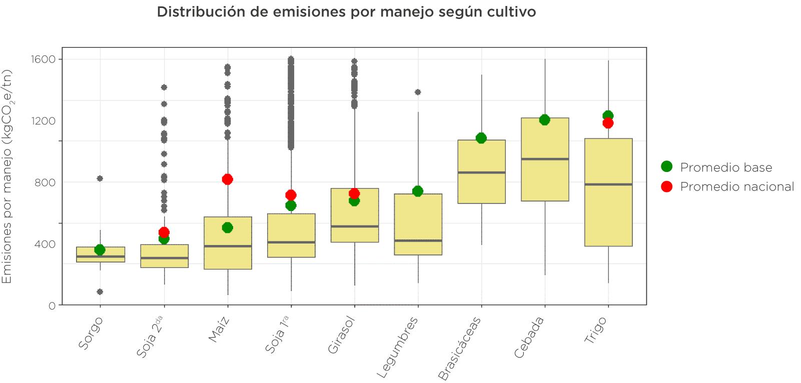 En soja, las emisiones se ubican en niveles relativamente bajos respecto a otros cultivos, debido a la ausencia de fertilización nitrogenada y al aporte de la fijación biológica de nitrógeno. No obstante, la soja 1ra muestra mayor variabilidad que la soja de segunda debido a la diversidad de ambientes y niveles de rendimiento en los que se