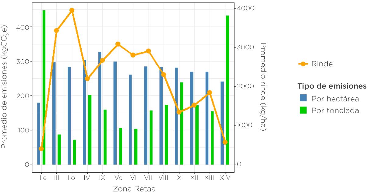 En los gráficos, las barras verdes representan el promedio de emisiones por tonelada de producto (kgCO2e/tn), mientras que las barras azules muestran el promedio de emisiones por hectárea (kgCO2e/ha). La línea anaranjada indica el rendimiento promedio de cada cultivo (kg/ha) en cada zona.