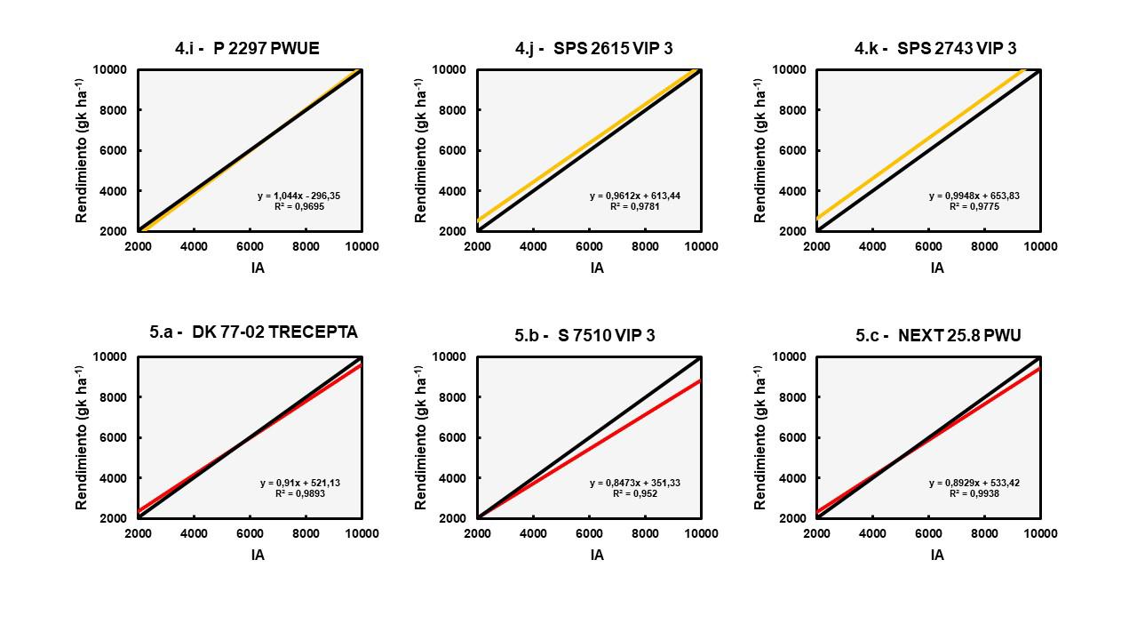 Por último, los híbridos DK 77-02 TRECEPTA, S 7510 VIP 3, NEXT 25.8 PWU, P 1804 PWUE y SS 2223S VIP 3 presentaron comportamiento adaptable a ambientes de baja productividad, con valores por encima o cercanos a la media en este tipo de ambientes (Figura 3.5).