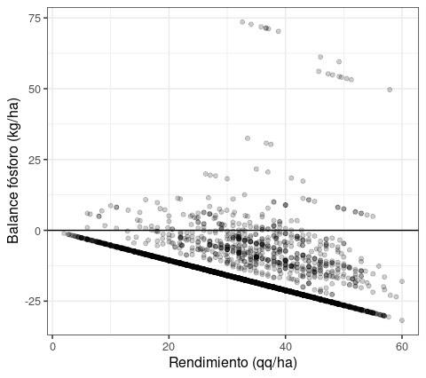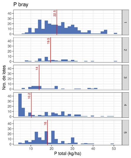 En materia de fósforo, la zona 1 presentó promedios de 22.5 ppm, la zona 2 registró promedios 19.5 ppm y la zona 5 promedió los 18 ppm, todas por encima de los umbrales de los cultivos de veranos pero con lotes complicados por deficiencia de fósforo. Por su parte, la zona 3 tuvo promedios de 14 ppm y la zona 4 promedió los 10.2 ppm (Gráfico 8). En función al rendimiento, salvo casos puntuales con estrategias de reposición, todos los lotes presentaron balances negativos (Gráfico 9).