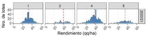 Para soja de segunda, la zona 1 mostró rendimientos promedios superiores a 30 qq/ ha, la zona 2 rendimientos medios de 38 qq/ha, sin diferencias significativas entre sojas de primera y segunda. Los rendimientos de la zona 4 fueron de 28 qq/ ha y de la zona 5, 37 qq/ha.