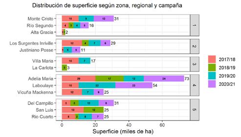 Los resultados de distintas zonas se integraron en cinco zonas productivas, que abarcan a distintas regionales: Zona 1 - Regionales Río Segundo, Montecristo y Alta Gracia; Zona 2 - J. Posse y Los Surgentes-Inriville; Zona 3 - Villa Maria; Zona 4 - Adelia Maria, Laboulaye y Vicuña Mackenna; y Zona 5 - Río IV y Del Campillo (Gráfico 2).