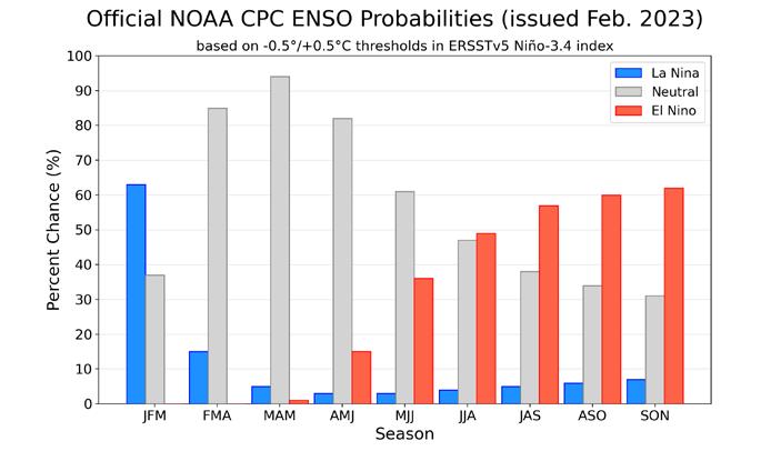 Figura 1. Probabilidades de eventos de La Niña, Neutral y El Niño por trimestre (año 2023).