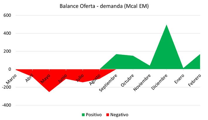 Figura 3 Balance entre oferta y demanda para un campo de cría con una carga de 1,3 EV/ha que utiliza alfalfa y avena como sus recursos forrajeros en pastoreo (en MCal EM).