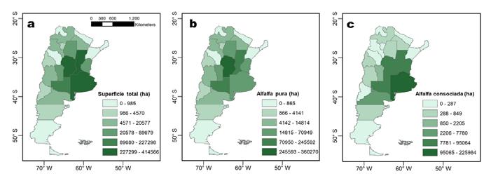 Figura 1. Provincias de Argentina sembradas con (a) alfalfa, en (b) planteos puros y (c) planteos mixtos (según datos del Censo Nacional Agropecuario, 2021).