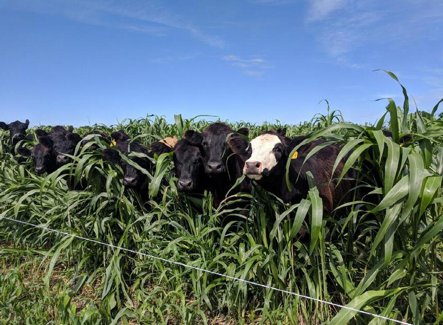 Novillos en un lote de sorgo diferido como alimento para el invierno.
