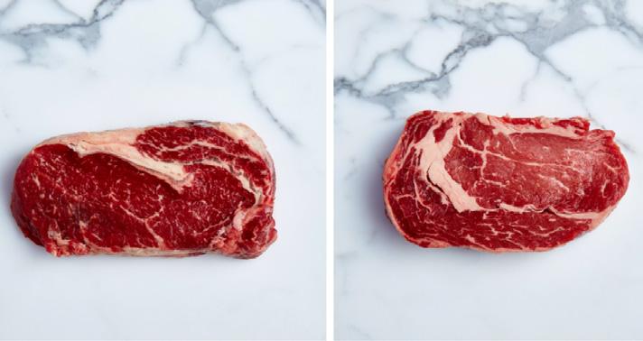 Foto 1. A la izquierda se observa un trozo de carne terminada a pasto, con grasa de color más amarillento y menor cantidad total de grasa (especialmente intramuscular). A la derecha se observa el mismo corte pero con mayor proporción de grano en la dieta, con mayor cantidad de grasa intramuscular.