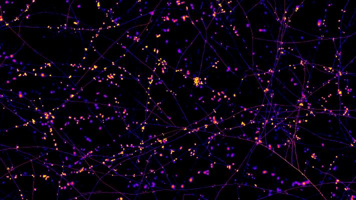 Imagen 2. Redes micorríticas y esporas (círculos brillantes en esta imagen). (Loreto Oyarte