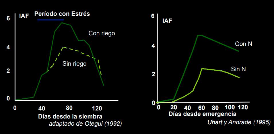 En la región Pampeana, los principales factores que limitan la producción del maíz son la oferta de agua y de nitrógeno (N) (Maddonni et al., 2003). Como muestra la Figura 1, ambas variables impactan sobre el índice de área foliar (IAF= Superficie foliar fotosintéticamente activa por unidad de superficie de suelo) de la gramínea. Así, las deficiencias hídricas y nutricionales reducen el tamaño de las hojas y aceleran su senescencia, lo que afecta la tasa de expansión foliar, la eficiencia de intercepción de la radiación (Uhart y Andrade, 1995) y, en consecuencia, la tasa de crecimiento y el número de granos. Es importante aclarar que el efecto de un estrés abiótico sobre el rendimiento depende tanto del momento en que ocurre como de su intensidad.