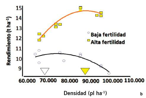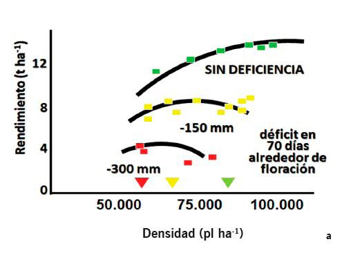 Figura 2: espuesta del rendimiento del cultivo de maíz a la densidad de siembra, en ambientes con distinto grado de restricción hídrica (a) o nutricional (b). Fuente: Maddonni, et al. (2021).