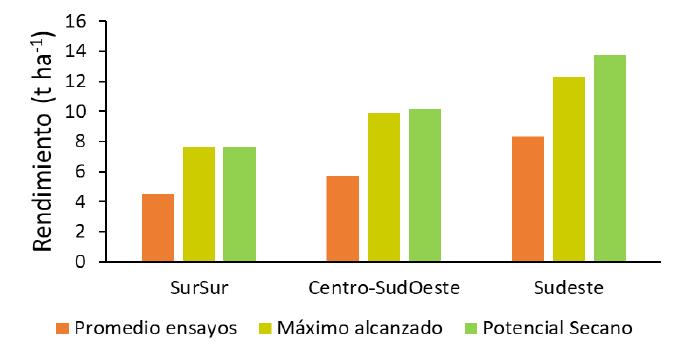 2). Por otro lado, el ensayo de máximo rendimiento en las subregiones Sur-Sur y Centro-Sudoeste -ensayo de mayor rinde considerando las siete campañas- logró un rendimiento similar al potencial estimado en condiciones de secano (Fig. 2). Podemos decir que los datos teóricos representaron el techo para los mejores ambientes en estas regiones. En cambio, en el Sudeste, la localidad con mayor rendimiento no alcanzó el nivel potencial en secano. Incluso el mejor híbrido evaluado dentro de esa localidad no logró igualar dicho rendimiento máximo esperado.