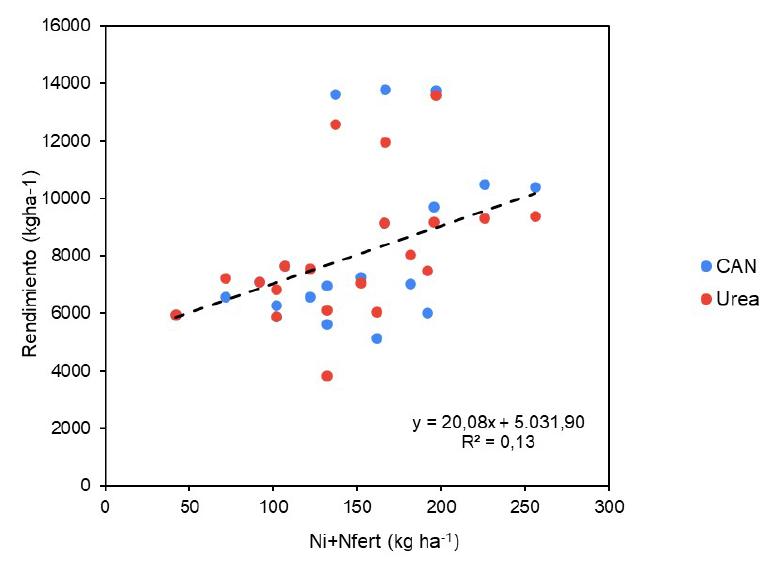 Figura 3. Relación entre la dosis total de N aplicado (Ninicial + Nfert) y el rendimiento (kg ha-1). Los puntos azules y rojos representan los tratamientos con CAN y Urea, respectivamente. La línea discontinua muestra la regresión lineal ajustada para el conjunto de datos (R² = 0,13).