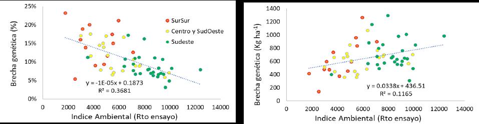 En cambio, en términos relativos, la brecha genética resultó mayor en los ambientes de menor índice ambiental (Fig. 3b).