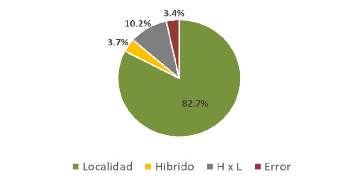 Como ocurrió en campañas anteriores, la localidad es la variable de análisis con mayor impacto sobre el rendimiento (Fig. 4). En particular, en esta campaña el efecto de la interacción resultó más relevante que el efecto híbrido, quien por sí solo explicó sólo el 3.7% de las variaciones del rendimiento. En principio, este resultado es contradictorio con respecto al análisis introductorio donde se analizaron varios años de la red. Por lo tanto, iremos considerando particularidades de cada localidad para dar una explicación al respecto.