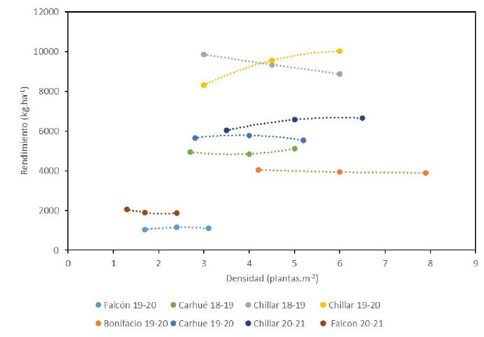 to aumentó con el incremento de la densidad, mientras que en Chillar 18-19, un aumento en la densidad resultó en una disminución del rendimiento. El comportamiento esperado y documentado en numerosos estudios sobre maíz es que la respuesta a un aumento en la densidad sea de tipo parabólico. Sin embargo, en varios de los sitios analizados en este trabajo, la respuesta del rendimiento ante variaciones en la densidad fue más bien lineal.