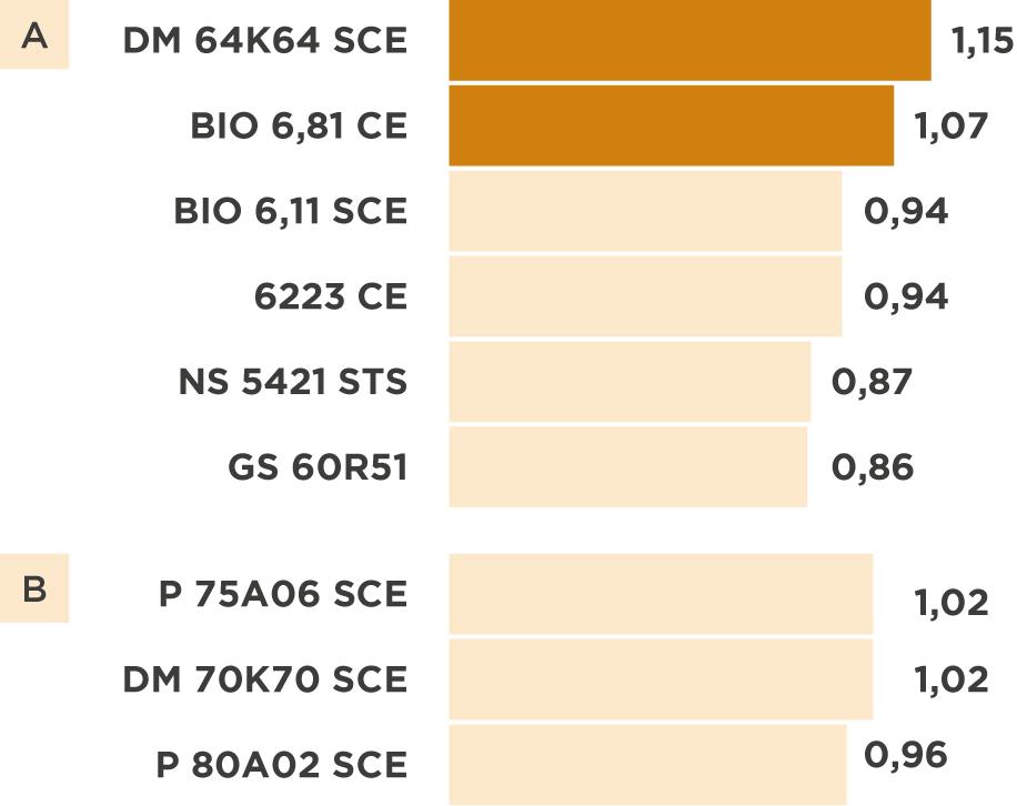 Durante la campaña 2024-25 en la RSNEA se evaluaron 9 variedades pertenecientes a los Grupos de Madurez (GM) V, VI, VII y VIII. Estos materiales fueron puestos a prueba en ensayos separados según su GM; de esta manera las variedades de GM V y VI fueron evaluadas en forma conjunta mientras que las variedades de GM VII y VIII también fueron evaluadas agrupadas por su ciclo, pero en ensayos separados de las primeras. Las variedades participantes en los ensayos de los GM cortos (V y VI) y sus características son