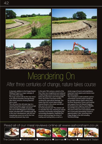 Meandering On After three centuries of change, nature takes course A dramatic addition to the Knepp Estate’s Wildland Project is a major redesign of part of the River Adur. The huge scheme will see the river return to its natural meanders through Knepp after three centuries of being directed into a canal. This will return the old water lags to a natural flood plain system and encourage richer diversity of wildlife and plants. The visit of AAH Magazine to the Knepp Estate coincided with a breakthrough day in the river’s development, with the new meandering course set out for the river meeting the present day route.