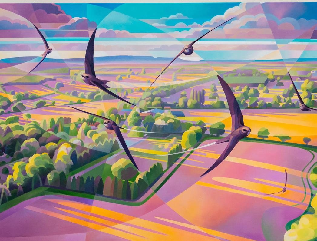 Alison: I’m known for abstract wildlife paintings and my most recent work, including Swifts Over Broomlands Farm, focuses on birds. I live in Warnham and would often see swifts at Broomlands Farm, until the roof was repaired and the colony was inadvertently lost. Swift numbers are in decline and that’s largely because of barn conversions and roof repairs. Thy colony moved to a neighbouring farm and I worked hard to encourage nesting at my house too, installing bird boxes. I also became involved in rescue work and by hand-rearing swifts, was able to learn more about them. There are many swift enthusiasts who like my recent work, so I’ve had commissions too. I particularly like the Broomlands Farm painting as it’s a different colour palette to most of my work with hues of purple, pink and orange that create warmer tones.