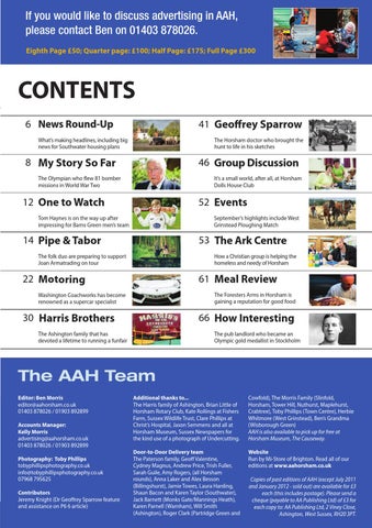 The AAH Team Editor: Ben Morris editor@aahorsham.co.uk 01403 878026 / 01903 892899 Accounts Manager: Kelly Morris advertising@aahorsham.co.uk 01403 878026 / 01903 892899 Photography: Toby Phillips tobyphillipsphotography.co.uk info@tobyphillipsphotography.co.uk 07968 795625 Contributors Jeremy Knight (Dr Geoffrey Sparrow feature and assistance on P6 6 article)
