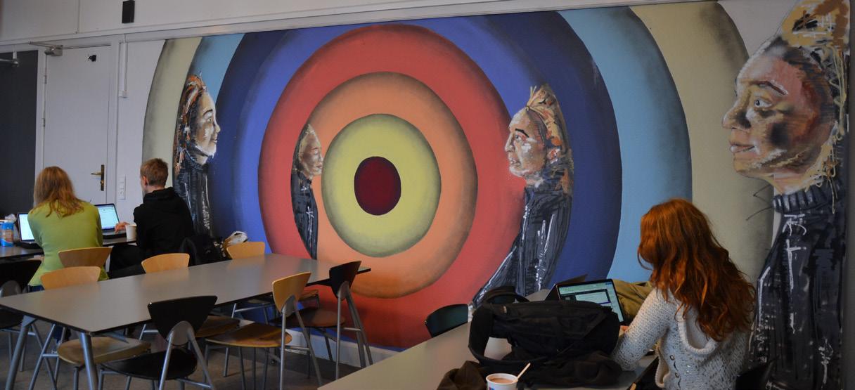 Eske har desuden brugt flere af de samme farver, som findes i Svend Engelunds vægmaleri i skolens festsal med henblik på at skabe en sammenhæng mellem kunstværkerne på skolen. Ud over det nye vægmaleri i elevkantinen har vi også fået restaureret Olivia Holm Møllers smukke malerier i festsalen. Malerierne var medtaget af tidens tand, men fremstår nu igen med flotte farver og glød.