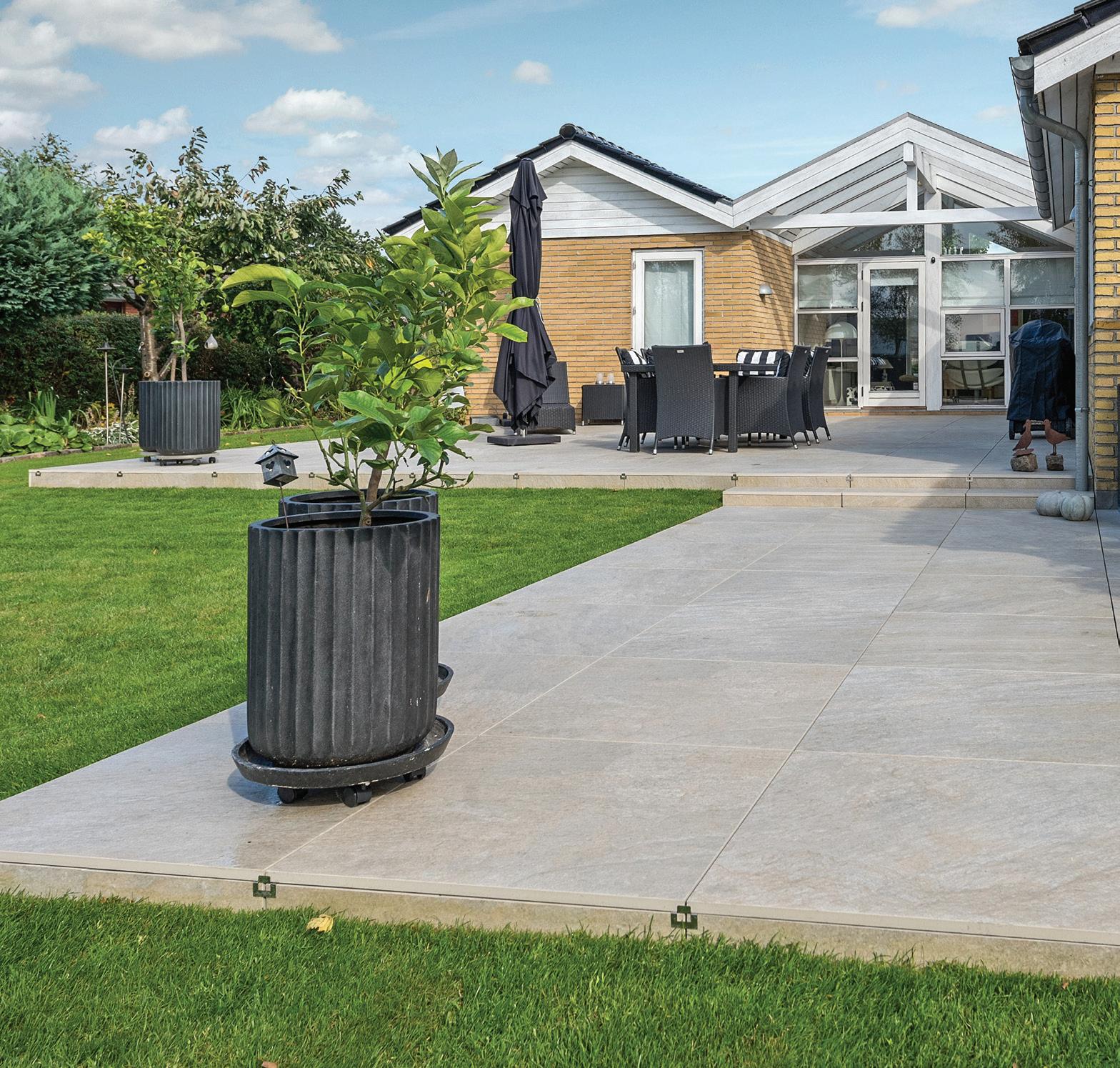 Fliserne kan lægges på græs, hvilket er ideelt til gangstier og flytbare terrasseområder i haven.