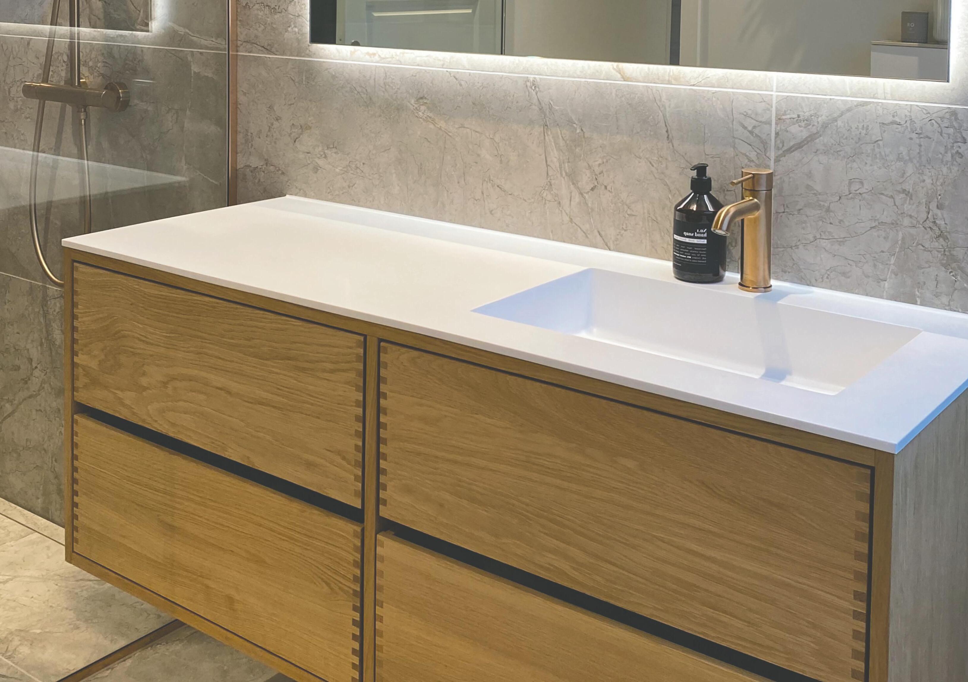 Et snedkermøbel i eg med flotte detaljer, giver en smuk kontrast til de typiske hårde og rene overflader, vi normalt indretter vores badeværelser med. Med NATUR får du en perfekt kombination af kvalitet, æstetik og funktionalitet, der med garanti vil bringe glæde og velvære! NATUR snedker badmøbler mange forskellige standardstørrelser fra bredde 45cm og op, samt smukke høj- og sideskabe.