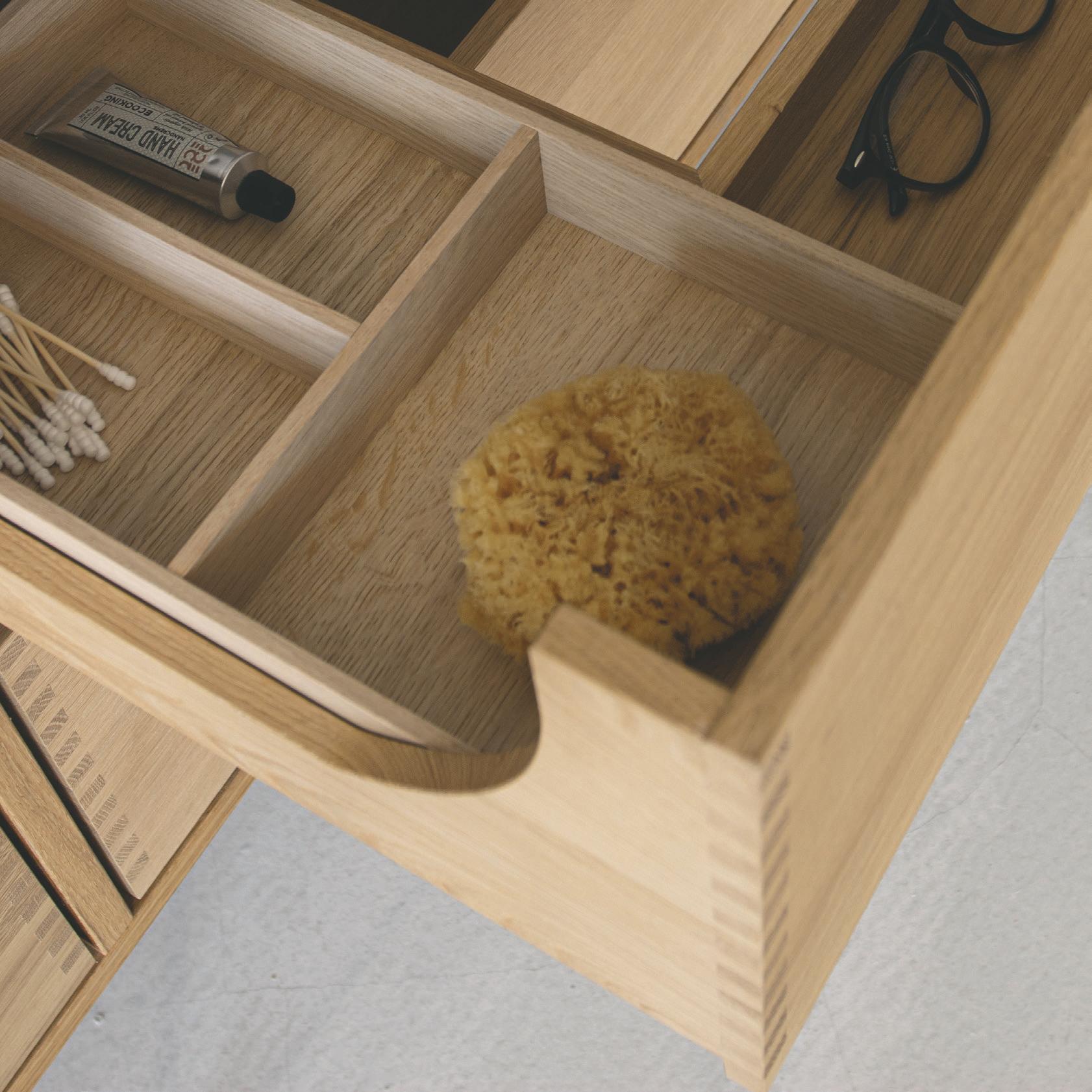 19mm korpus i egefiner behandlet med naturolie med massive og fingertappede skuffer i eg.
