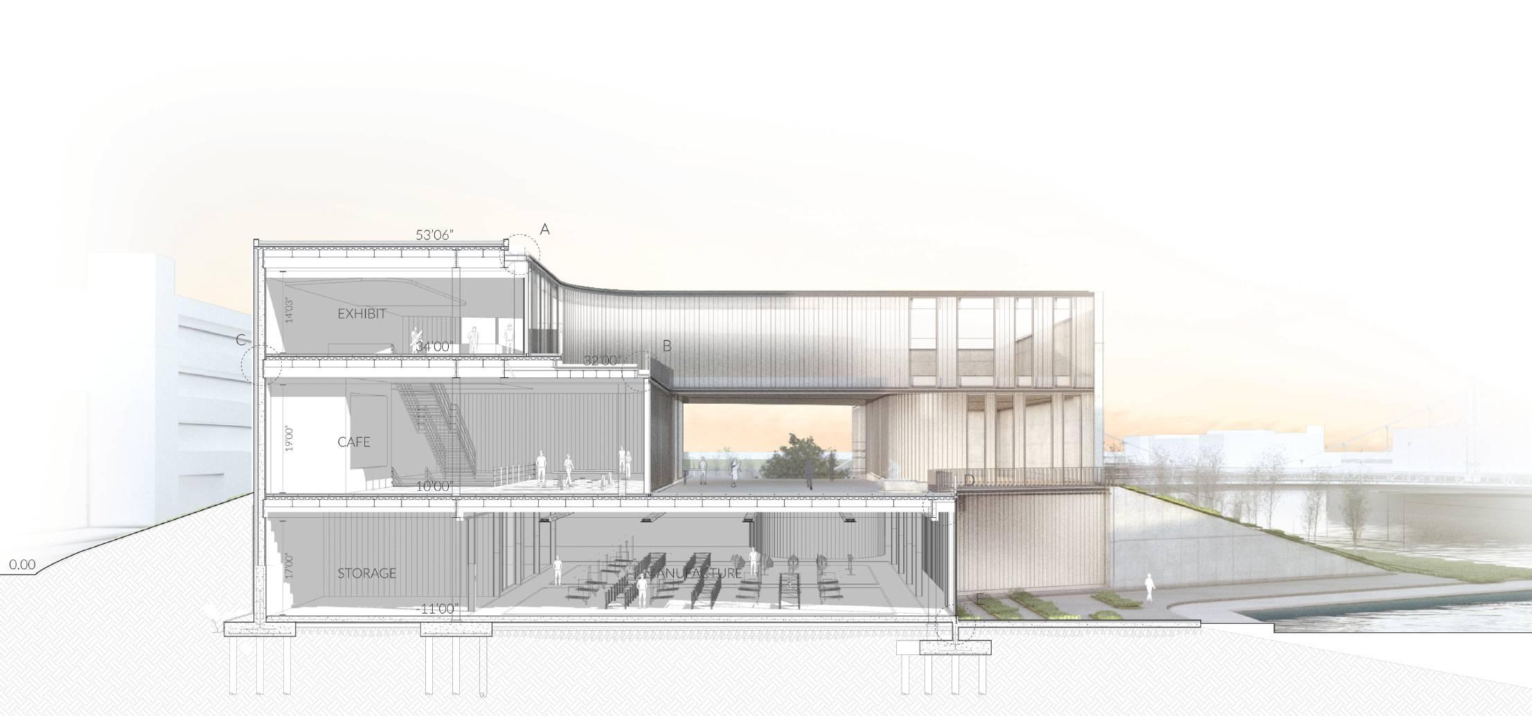 transformation, and being transformed into socio-economical corridors, mainly being located at the edge of the river. Therefore the proposal aims to create a passage between the city and the Chicago River, stitching them together to the urban fabric. The transformation of a scrapyard into a cultural hub was proposed. The architectural gesture responds to the adjacent context by providing sights and passage to the main places of the area.