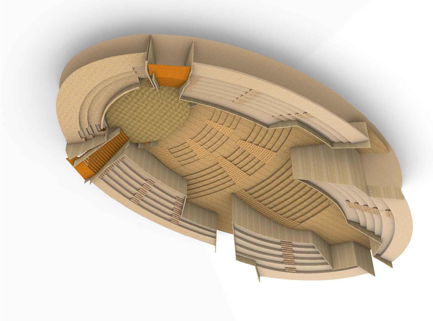 The split-level seating arrangement integrates balconies, mezzanines, and ramps to create a spatial rhythm that encourages both vertical and horizontal movement, while also responding to varying programmatic demands This form ensures dynamic sightlines and allows the audience to feel closer to the performer, regardless of their location within the space